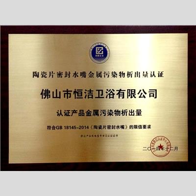奖 项:陶瓷片密封水嘴金属污染物析出量认证 佛山市广东恒洁卫浴有限公司有限公司 认证产品金属污染物析出量 符合GB 18145-2014《陶瓷片密封水嘴》的限值要求