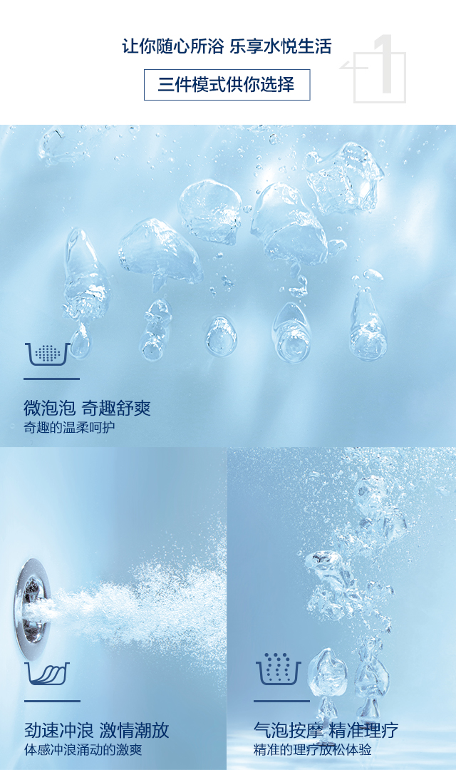 水疗独立按摩系统、劲速冲浪按摩系统、微泡泡按摩系统及汽泡按摩系统三件模式供你选择,让你随心所浴,乐享水悦生活